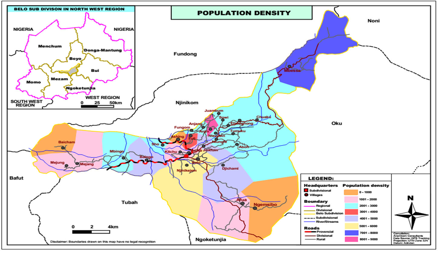 The estimated population of Belo stands at 88,664 inhabitants. The council area is made up of 5 ethnic groupings namely: Kom, Mbessa, Mejanng, Mejunng, Baicham and the Mbororos. On the general scale, the population distribution by village is per the table below